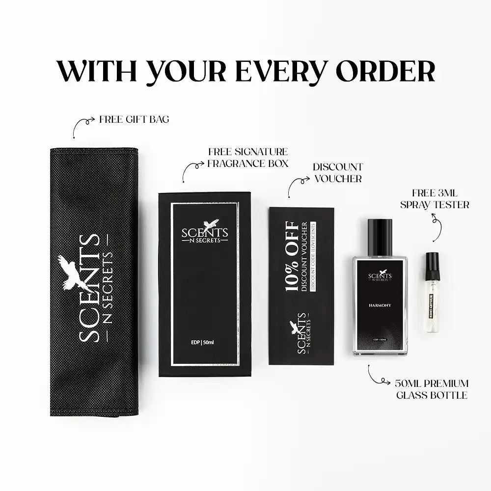 The journey comes to an end with a warm and seductive base where Patchouli, Clary Sage, Amber, Virginia Cedar, and Woodsy Notes linger to create a rich, warm, and welcoming atmosphere.